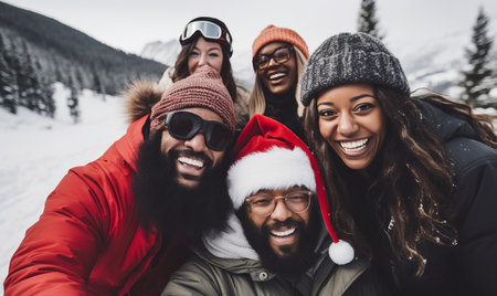 A group of friends having fun and celebrating Christmas outdoors at a snowy ski resort