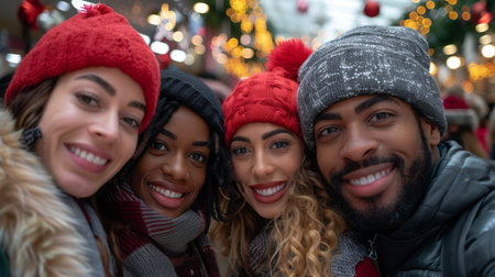 This image features a multi-ethnic group in winter clothes at a festive market, capturing a selfie; perfect for travel blogs, social media, and holiday advertising campaigns.