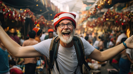 Wanderlust-filled photographer with Santa hat shoots bustling market scene