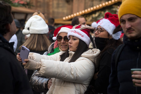Strasbourg - France - 26 November 2022 - Portrait of women wearing a christmas hat taking a photo with her smartphone