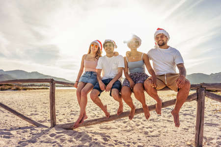 Friends Celebrating Christmas on Tropical Beach, Wearing Santa Hats, Having Fun in Sun.