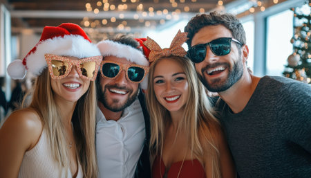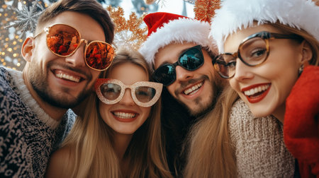 A vibrant group of friends joyfully celebrating the holiday season, showcasing smiles and togetherness surrounded by festive decor and warm lighting.