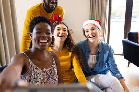 Image of happy diverse friends celebrating christmas at home taking selfie. Christmas, celebration, tradition, friendship, inclusivity and lifestyle concept.