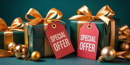 Teal gift boxes with gold ribbons and red special offer tags with gold ornaments on a dark background