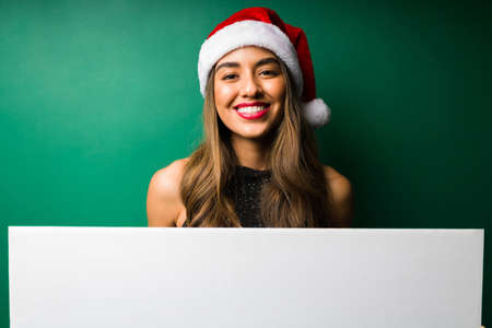 Close up of a beautiful young woman holding a big blank sign for Christmas and feeling happy