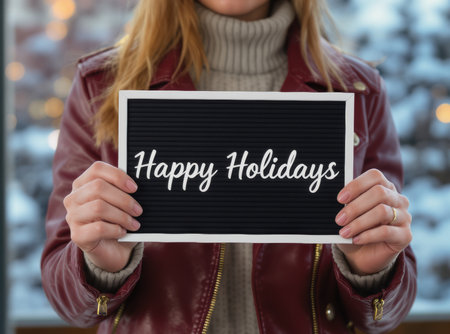Close-up of a woman in a red jacket and gray sweater holding a black letterboard with the text Happy Holidays. Blurred snowy background adds a festive, cozy atmosphere.