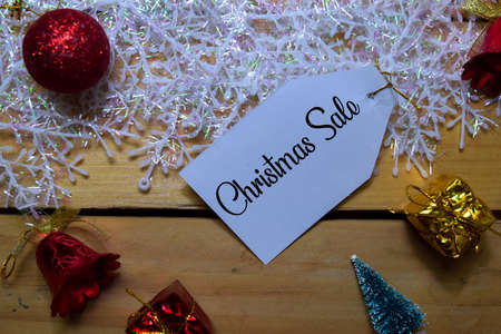 Christmas Sale write on label with wooden backgroud. Frame of Christmas Decoration.