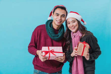 Happy young Asian couple holding Christmas gift boxes with happy smiling face isolated on blue background in studio shot.Christmas celebration of lover concept.