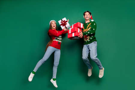 Photo of funky carefree couple hold pile present jump wear hat ugly sweater isolated green color background