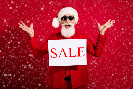 Photo of impressed funny mature man dressed christmas costume hat holding sale placard isolated red color background