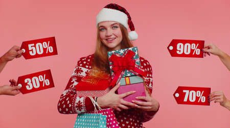 Adult girl in Christmas sweater holding many gift boxes and receive discounts inscriptions banner texts. Black Friday. Good holiday low prices for shopping. Woman on pink studio background. New Year