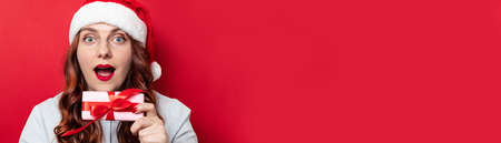 Happy Santa hat female smiling and giving present with satin ribbon bow on red background, copy space. New year winter holiday xmas concept