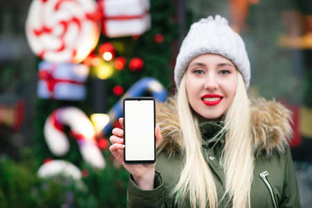A beautiful girl in a warm winter hat holds a cell phone in her hand a blank white screen mockup. Background empty space for advertising. Christmas and New Year shopping
