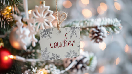 A close-up of a hand offering a holiday-themed gift card against a decorated Christmas tree background