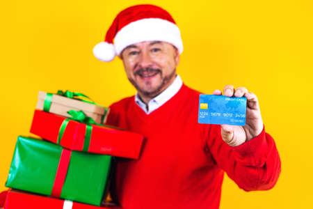 latin senior man holding a credit card and Christmas presents with santa hat on yellow background in Mexico Latin America