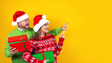 latin father and daughter in red sweater Christmas santa hat holding christmas presents pointing copy space on yellow background in Mexico Latin America
