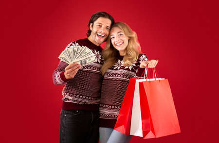Xmas shopping. Lovely young couple in winter clothes holding money and gift bags on red background
