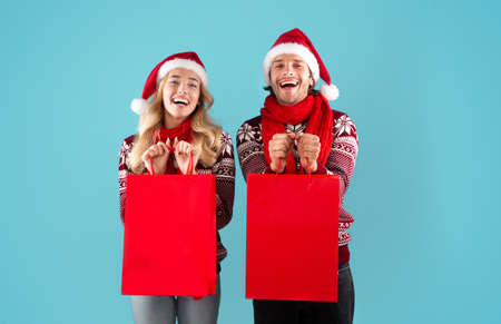 Young man and his girlfriend holding shopping bags with Christmas gifts on blue background, space for design. Panorama