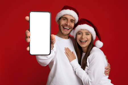 Great App. Happy Young Couple Wearing Santa Hats Showing Blank Smartphone Screen