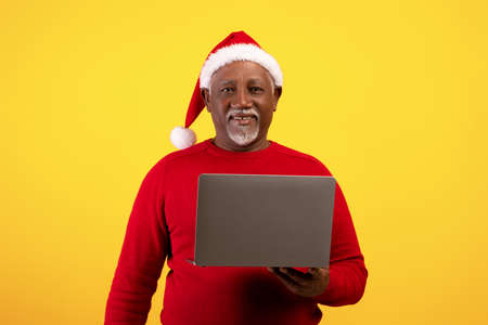 Online Christmas shopping. Happy senior African American man posing with laptop computer and smiling at camera