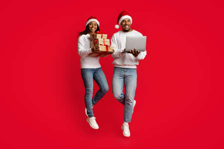 Cheerful Young Couple Wearing Santa Hats Pointing At Laptop With Blank Screen