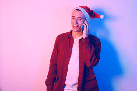 A man in a santa hat in neon light. The guy is talking on the phone, and he relaxes. New Year Christmas.