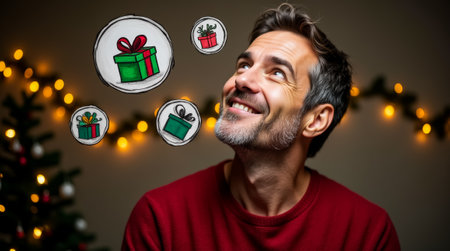 A man wearing a warm sweater beams with joy, surrounded by twinkling holiday lights and cheerful gift illustrations, embodying the spirit of Christmas.