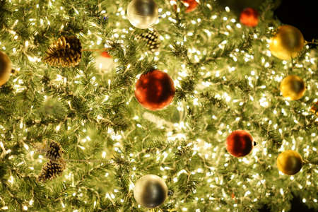 Christmas tree with many beautiful ornaments background. Winter holidays concept.