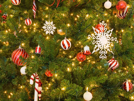 Red and White Christmas Ornaments on a Green Tree with White Lights