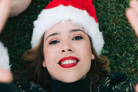 Portrait of a happy adult woman taking a selfie at Christmas in the garden of the park outdoors wearing a Santa hat. top view.