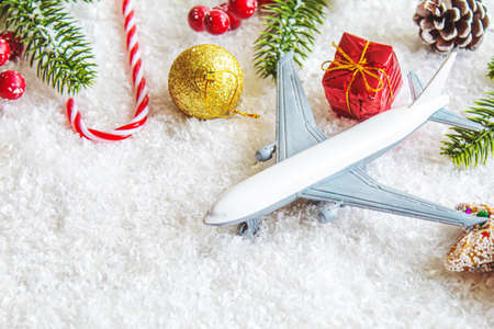 Travel for Christmas. Airplane with Christmas decor.New year.Selective focus.holidays