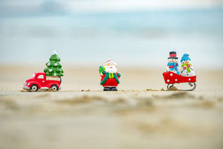 Santa and snowman decoration at ocean beach. Christmas and New Years vacation in hot countries.