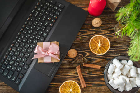 Gift box with pink ribbon on laptop. Purchase discounts for the new year in online stores on Christmas eve. Top view