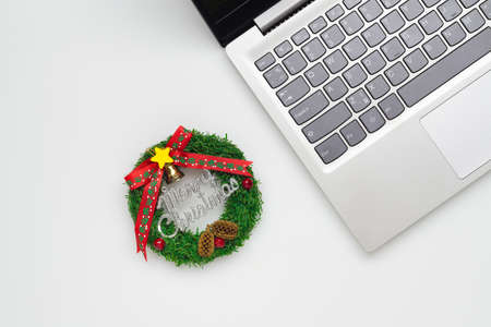 Merry Christmas and Happy new years office work space desktop concept. Flat lay top view with laptop and Christmas ornaments sign with copy space.