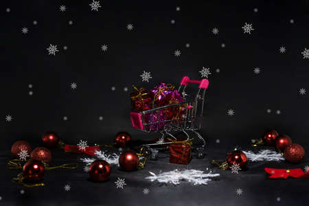Black Friday abstract photo. Happy Merry Christmas. Shopping cart with decorative presents.