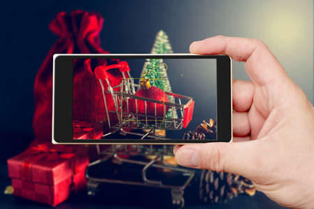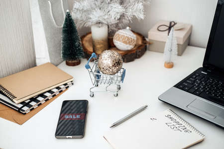 Christmas online shopping, winter sale, black Friday. Christmas ornament toy ball in shopping cart, smartphone with text Sale, shopping list, Laptop on table.