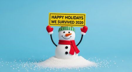 A cheerful snowman wearing a scarf and hat holds a sign that says Happy Holidays We Survived 2020.