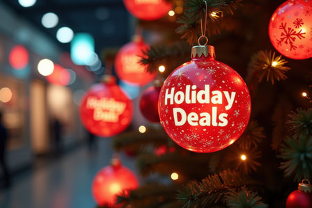 Holiday shopping season decoration with festive ornament display and winter atmosphere.