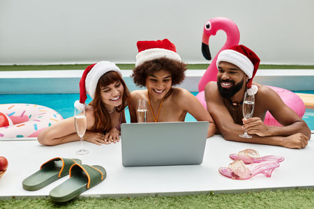 Young friends in Santa hats share laughter and joy while celebrating Christmas by the pool.