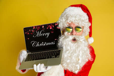 Greeting flyer for ad. Concept of Christmas, 2021 New Years party, winter mood, holidays. Copyspace, postcard. Santa Claus in stylish outfit holding laptop with Merry Christmas lettering on screen