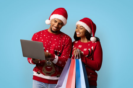 Couple in Christmas Sweaters Looking at a Laptop While Holding Shopping Bags Against a Blue Background