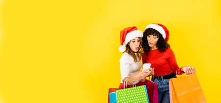 Two attractive women with Santa hat looking to a smartphone excited and surprised - Big yellow banner with female people doing shopping online holding colored shopping bags on yellow big copy space