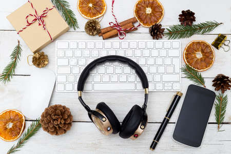 New Year's workplace with headphones and Christmas decorations. Flat lay