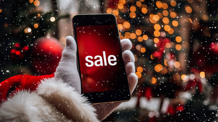 hand in Santa glove holds smartphone displaying sale message, with festive holiday lights and snowflakes in background, creating cheerful Christmas shopping atmosphere.
