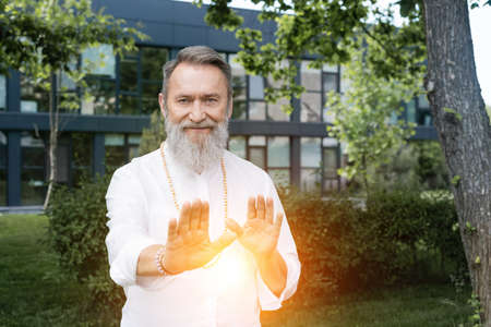 bearded spiritual mentor looking at camera near light of aura outdoors