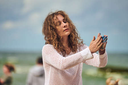 Svetlogorsk, Russia, 08.15.2021 - Female dance performance on sunny beach, sea waves and horizon background. Woman dancer dancing to music on beach by sea. Choreography lesson, outdoor dancing
