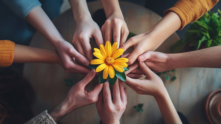 Teamwork concept. Close up of human hands holding yellow flower.