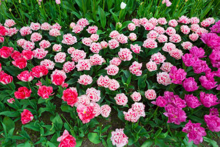 Beautiful colorful terry tulips in full bloom in the garden, view from above against dark green leaves. Natural floral texture for background.