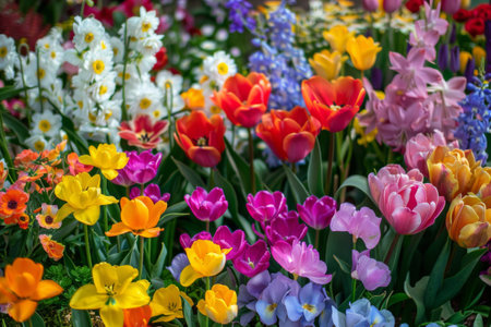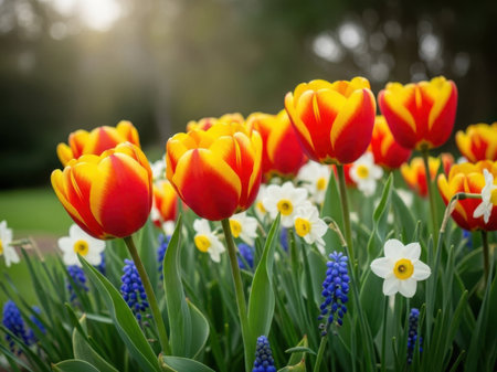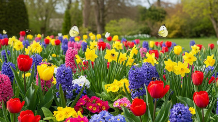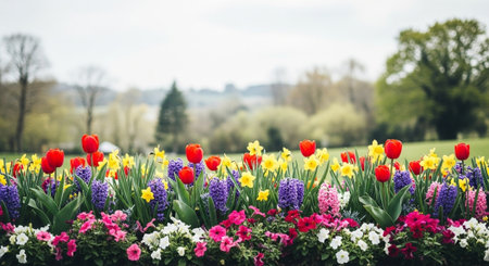 Vibrant flowerbed with tulips, daffodils, and hyacinths in spring