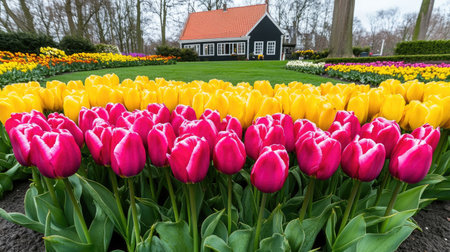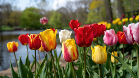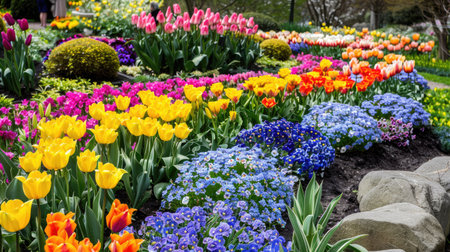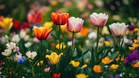 Vibrant garden filled with colorful tulips and daffodils, showcasing beautiful array of flowers in various shades of pink, yellow, and purple. lush greenery enhances serene atmosphere